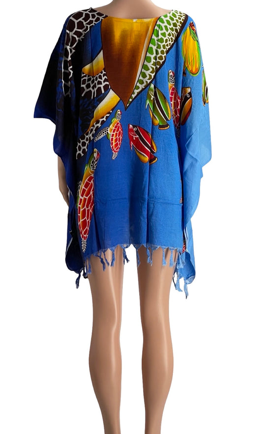 Colorful Sea Turtle Print Kaftan Cover-Up – Lightweight Rayon Beach Dress with Tassel Hem – One Size Fits Most